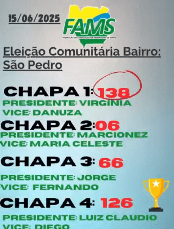 A comunidade do Bairro São Pedro viveu no domingo (16) um importante momento democrático com a realização da eleição para a nova diretoria da Associação de Moradores. Com 138 votos, a Chapa 1 saiu vitoriosa, elegendo Virginia Nara como presidente e Danuza como vice-presidente da entidade.